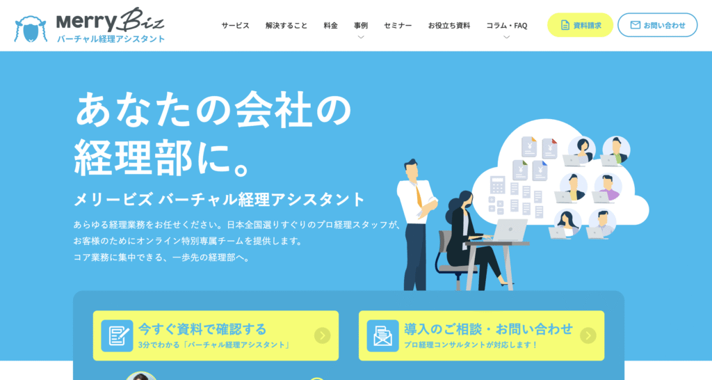 メリービズの「バーチャル経理アシスタント」は、企業ごとに最適な経理チームを編成してくれるサービスです。全国に750名在籍する簿記2級以上の資格を持つ実務経験豊富なスタッフが、オンラインで経理業務をサポートしてくれます。