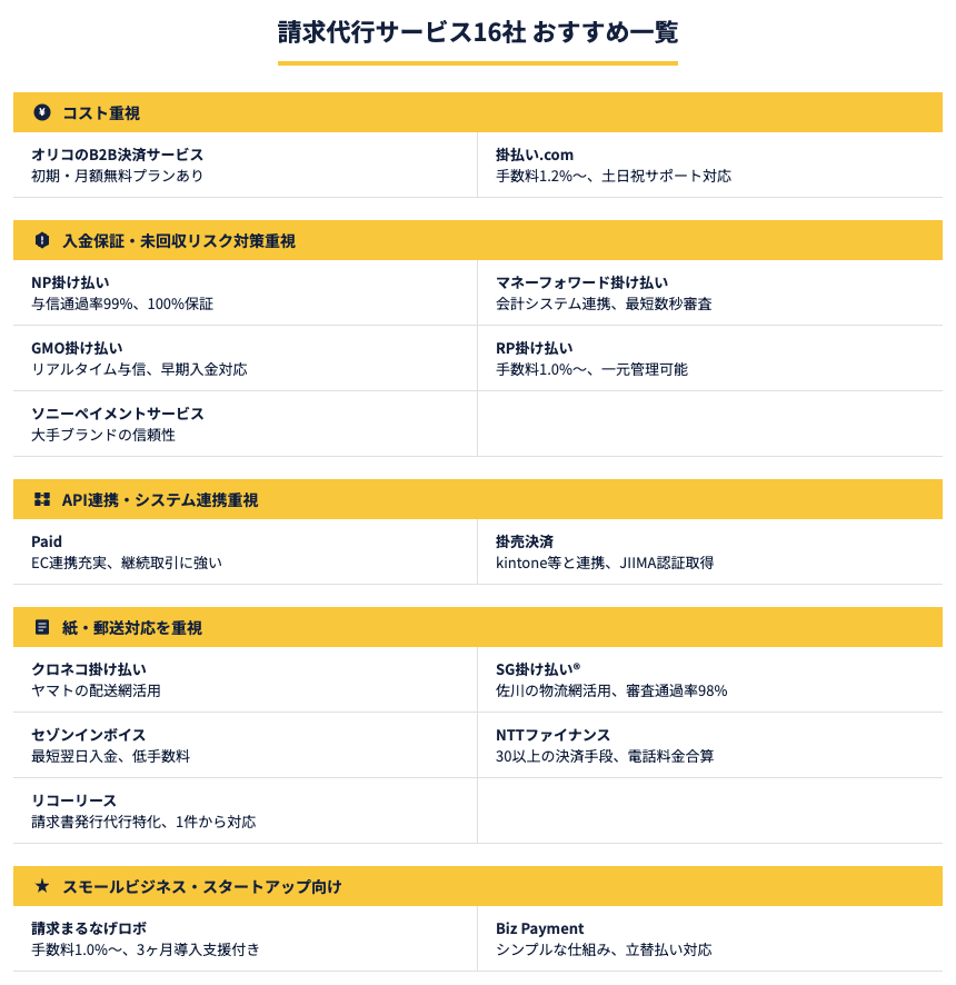 これまで紹介してきた16社の請求代行サービスを、わかりやすく一覧表にまとめました。各サービスの料金体系や特徴を比較検討する際にご活用ください。