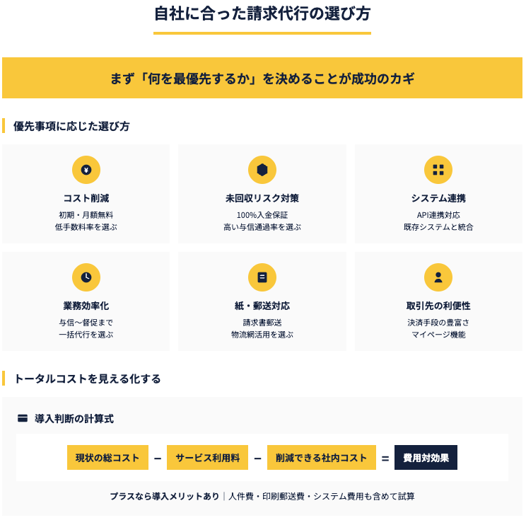 請求代行サービスを選ぶ際、重視するポイントは企業によって異なります。コストを抑えたい企業もあれば、未回収リスクの保証を最優先する企業もあるでしょう。また、既存システムとの連携性や、紙の請求書発行への対応など、実務上の要件も重要な判断材料となります。