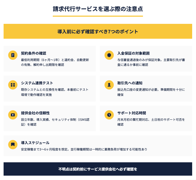これらの注意点を事前に確認し、対策を講じておくことで、請求代行サービスの導入をスムーズに進めることができます。不明な点があれば、契約前にサービス提供会社に必ず確認するようにしてください。