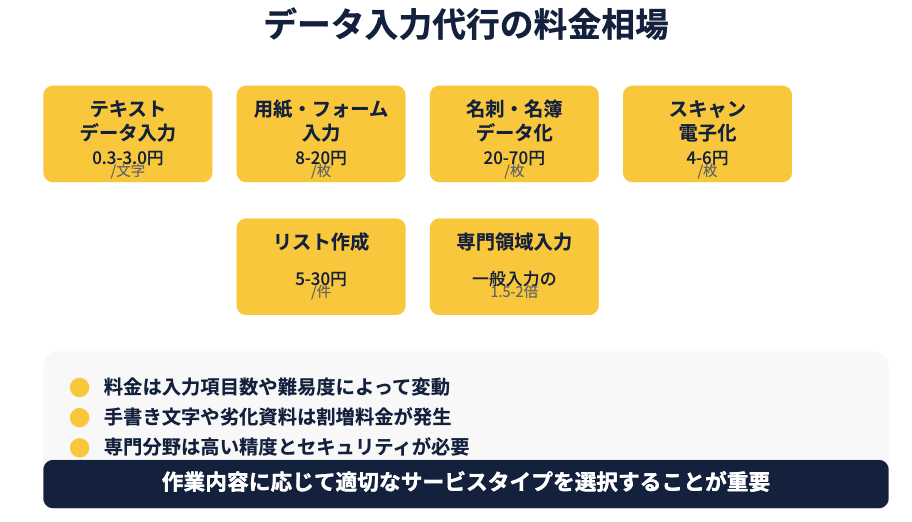 データ入力代行サービスを利用する際の料金は、入力タイプによって課金方式や費用感が大きく異なります。