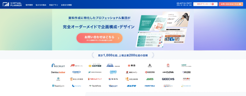 バーチャルプランナーは、資料作成代行業界で最高峰の品質を誇る老舗企業です。創業9年で累計1,000社以上、3,000部以上の資料制作実績を持ち、その圧倒的な経験値が同社の強みとなっています。