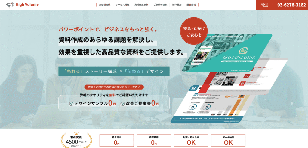 High volumeは、その名前が示す通り大量の資料制作を得意とする資料作成代行会社です。専門コンサルタントが課題をヒアリングし、「売れる」ストーリーと「伝わる」デザインを重視したビジネスに強い資料作成をサポートしています。
