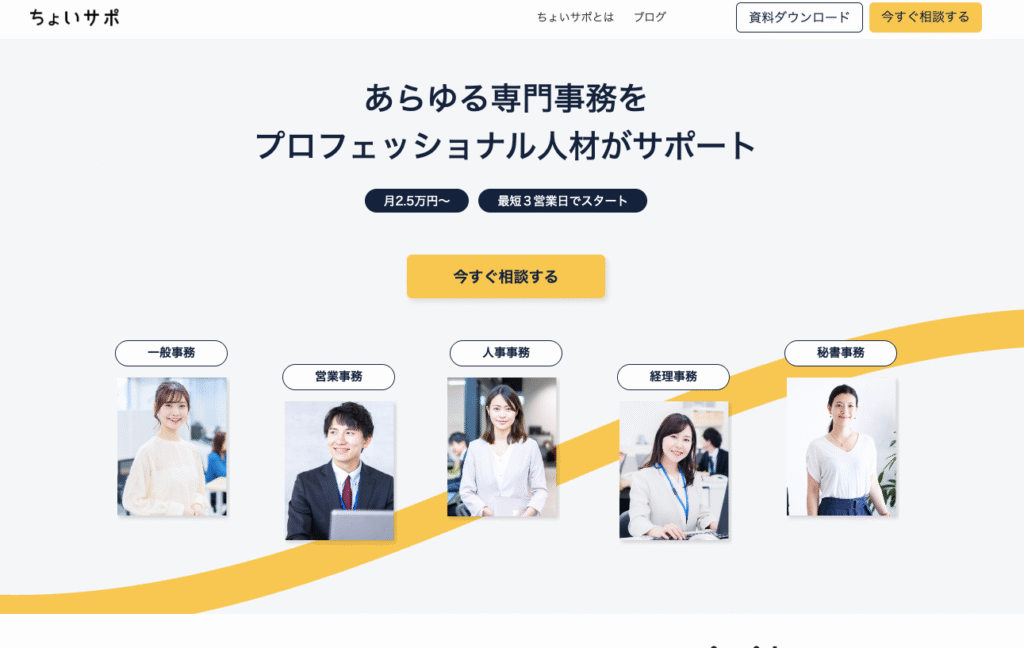 ちょいサポは、日本エキスパートホールディングスが運営する総合的な事務代行サービスです。資料作成だけでなく、一般事務、営業事務、経理事務、人事事務、秘書事務など10種類以上の専門事務を、月2.5万円という手頃な料金からご利用いただけます。
