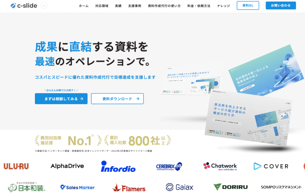 c-slideは「成果に直結する資料を最速のオペレーションで」をコンセプトに掲げる資料作成代行会社です。最短2日という驚異的なスピード納品を実現しながら、デザイン品質も妥協しない点が最大の魅力となっています。