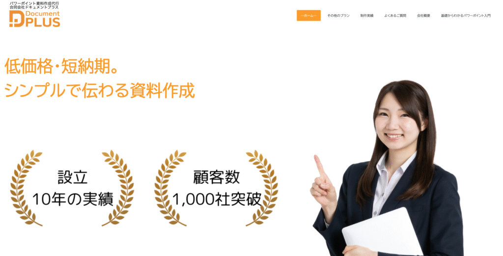ドキュメントプラスは「低価格・短納期」を掲げ、業界最安水準の1ページ2,500円という価格設定で資料作成代行サービスを提供しています。「デザイン性よりも伝わることに重きを置いた」資料作成を得意とし、シンプルで分かりやすい資料を求める企業に最適です。