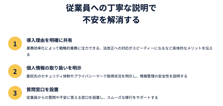 個人情報の取り扱いについても不安を感じる従業員がいるため、委託先のセキュリティ体制やプライバシーマーク取得状況などを明示しましょう。質問や不安に答える窓口を設置しておくと、よりスムーズな移行が可能です。