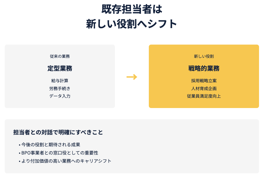 人事BPOの導入によって最も影響を受けるのが、これまで給与計算や労務手続きを担当していた社内メンバー。「自分の仕事がなくなるのでは」という不安を抱くケースも少なくありません。