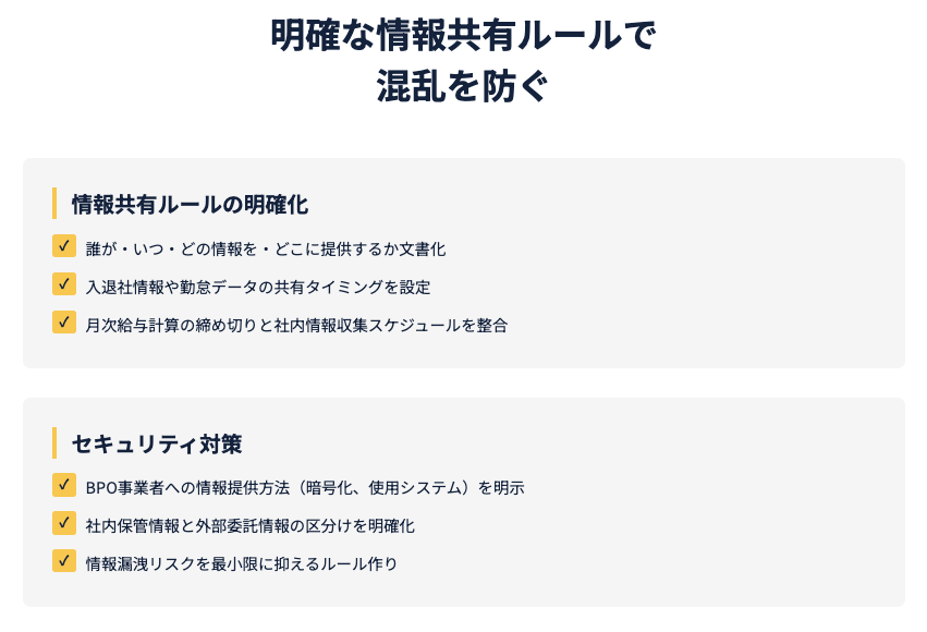 例えば、従業員の入退社情報は誰がいつまでにBPO事業者に連絡するのか、勤怠データはどのタイミングで共有するのか、といった具体的な手順を文書化しましょう。特に月次の給与計算に関わる情報は、締め切りが厳格なため、社内での情報収集スケジュールも併せて設定する必要があります。