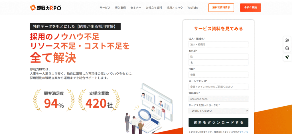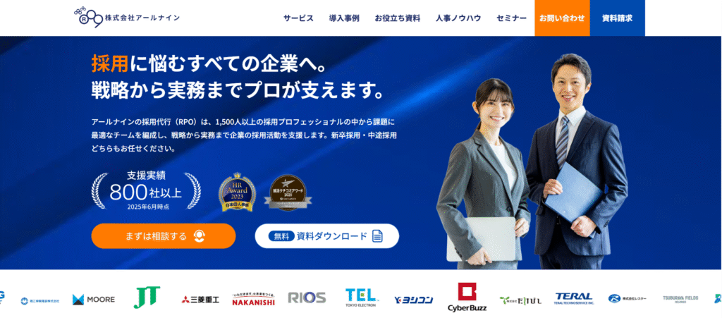 おすすめポイント:顧客満足度90%、継続率97%という高い数値が示すように、丁寧なサポートが魅力。初めて採用代行を利用する企業でも始めやすい料金プランも用意されているため、まずは小規模から試してみたい企業に適しています。