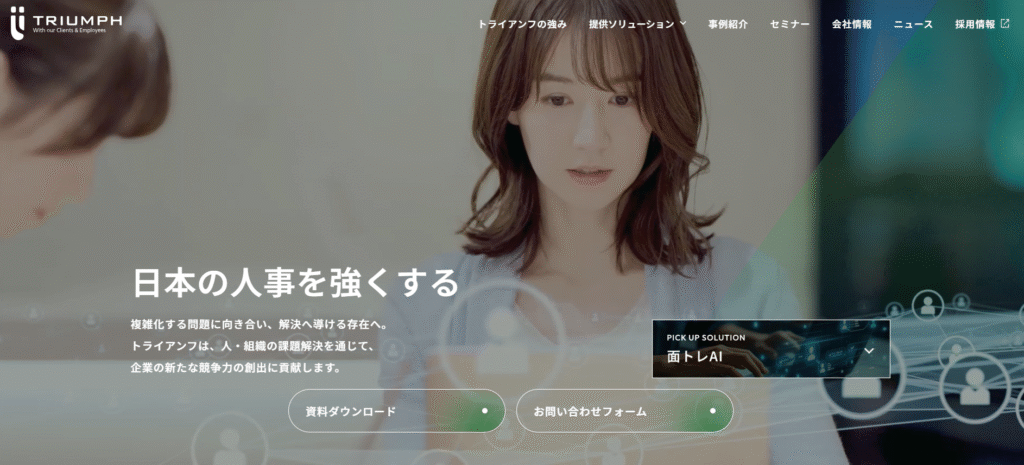 株式会社トライアンフは、面接官向けの研修サービスを提供している企業として、面接のプロフェッショナルが多数在籍。800社以上の導入実績があり、サービス業やメーカー、ソフトウェア情報処理、公社・官庁まで幅広い業種に対応しています。