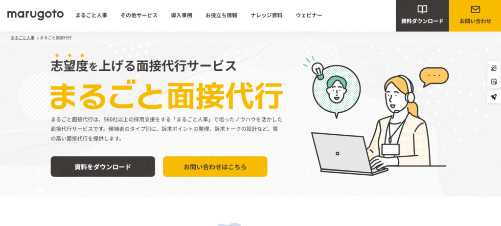 まるごと面接代行は、採用代行サービス「まるごと人事」で培ったノウハウを活かした面談・面接代行サービス。人事経験豊富なメンバーが、ターゲットに合わせた訴求ポイントの整理や候補者のタイプ別トーク作成など、徹底的にサポートしてくれます。