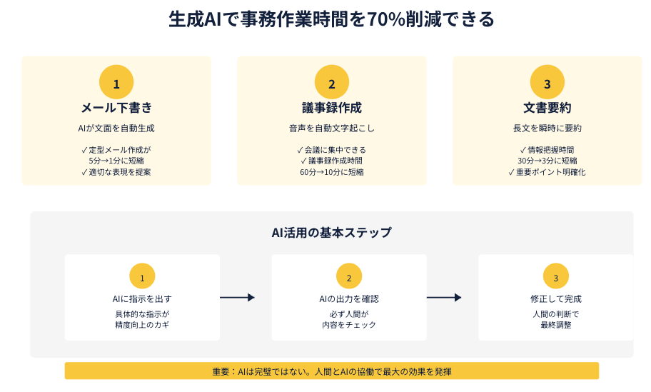 | 営業事務 | 顧客データの一元管理、見積書・請求書の自動作成、スケジュール管理の効率化 | 営業事務の効率化方法7選!生成AIの活用法や便利なツールも紹介 |