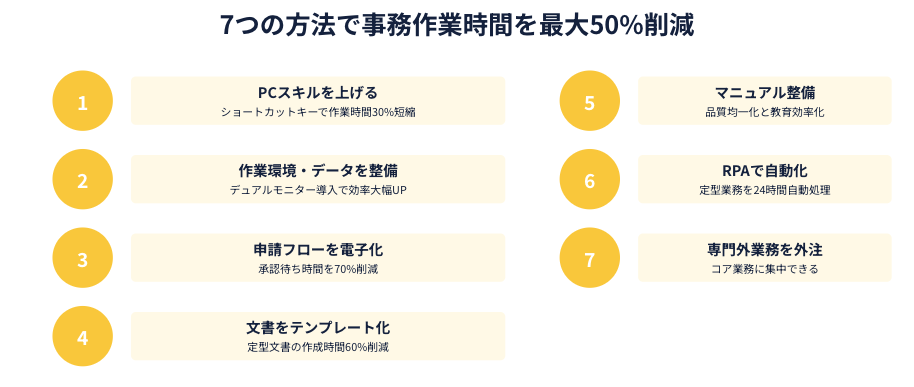 事務作業の効率化には様々な方法があります。ここでは、すぐに実践できる効果的な方法を以下7つ紹介します。