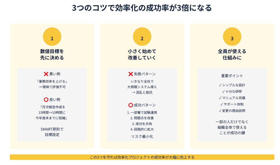 さらに、効率化を成功させるための具体的なステップや、導入しやすい効率化ツールについても詳しく説明していきます。