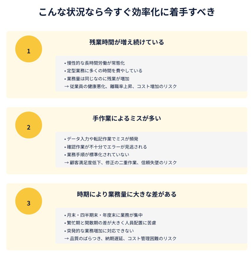 以下のような状況が発生している場合は、効率化を検討するタイミングかもしれません。