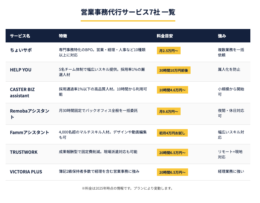 営業事務代行サービス選びで迷っている方に向けて、特徴の異なる代表的なサービスを厳選してご紹介します。以下の8つのサービスから、自社のニーズに最適なものを見つけてください