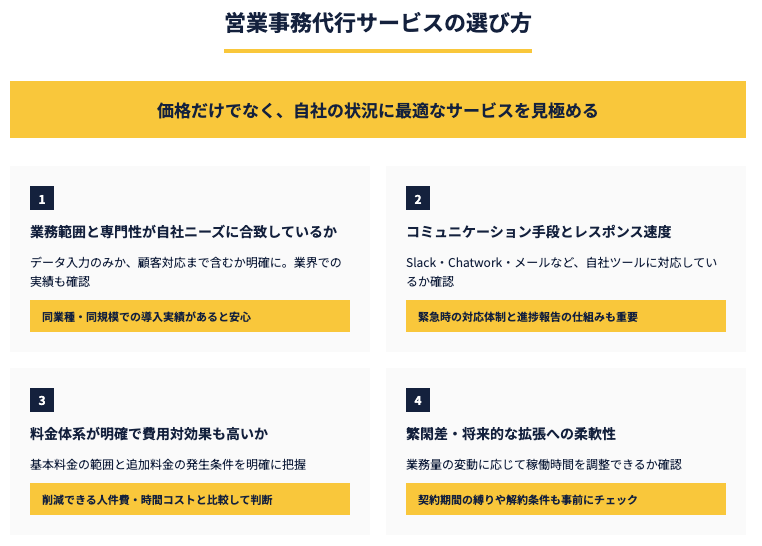 営業事務代行サービスを選ぶ際は、単純に価格だけで判断するのではなく、自社の状況に最適なサービスを見極めることが重要です。失敗しないサービス選びのために、以下の4つのポイントを確認しましょう。