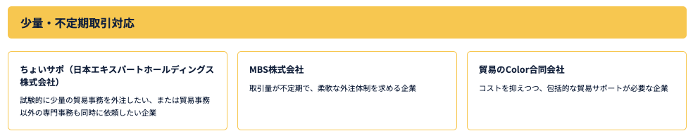 | どんなケースにおすすめか | 試験的に少量の貿易事務を外注したい、または貿易事務以外の専門事務も同時に依頼したい企業 |